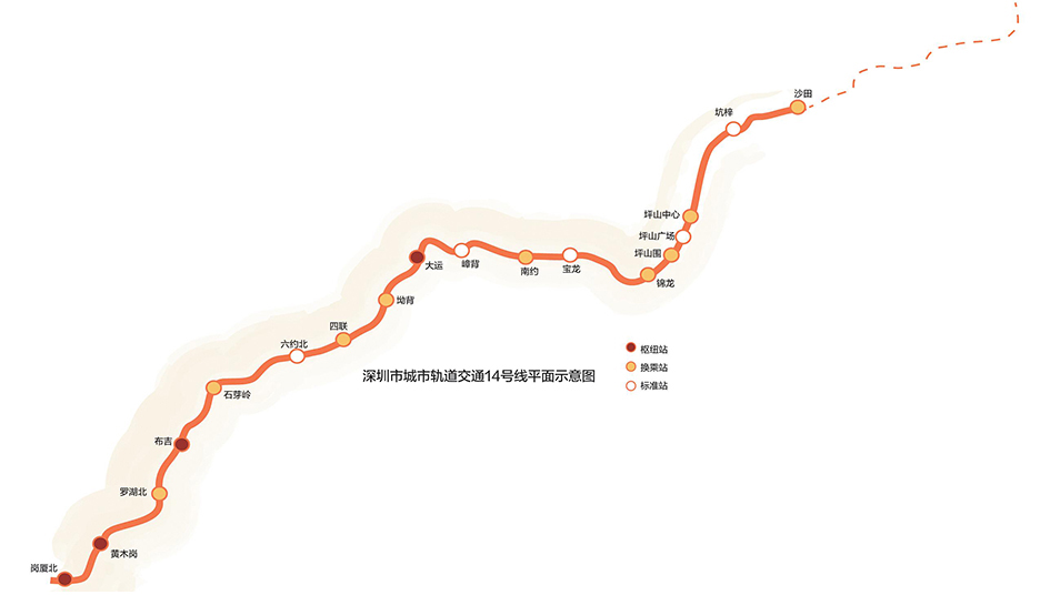 地铁14号线全长50.34公里,是深圳轨道交通四期工程最长的线路,途经福田、罗湖、龙岗、坪山四区,共设车站18座,包括4座枢纽站、9座换乘站,全程通行时间约55分钟。通车后,从福田到坪山仅需40分钟。11号线福岗区间的同步开通则将宝安、南山区域连接至东部交通网中。