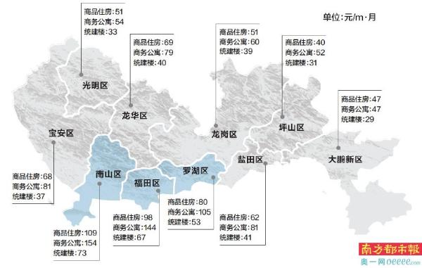 据了解,早在2016年,深圳市房屋租赁管理办公室曾正式对外发布《深圳市2016年房屋租赁指导租金表》,全市采集3万余个信息点,市民可在表格中详细查询片区租房价格。据当时的指导租金表,2016年深圳住宅租金平均为24.6元/㎡。其中,福田住宅租金为47.3元/㎡,南山片区的各类型住宅出租屋平均月租金为51.6元/㎡,罗湖区住宅类租金为44.2元/㎡