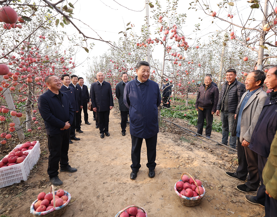 10月26日至28日,中共中央总书记、国家主席、中央军委主席习近平在陕西省延安市、河南省安阳市考察。这是26日下午,习近平在延安市安塞区高桥镇南沟村苹果园同老乡们亲切交流。 新华社发