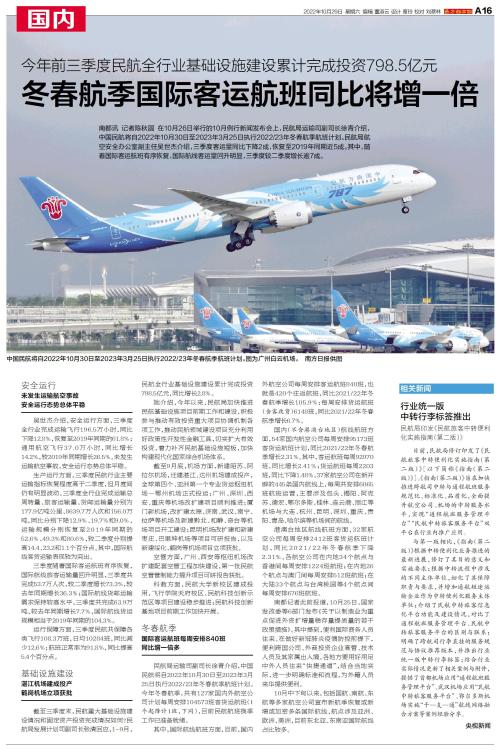民航局运输司副司长徐青介绍,中国民航将自2022年10月30日至2023年3月25日执行2022/23年冬春航季航班计划。