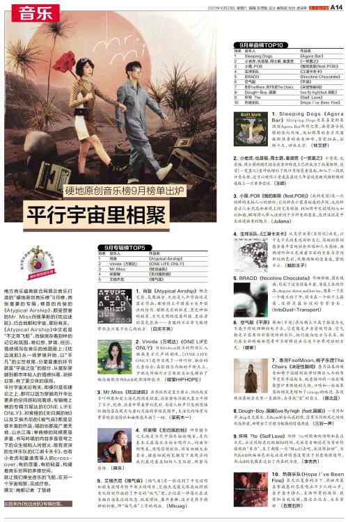 南方音乐盛典联合网易云音乐打造的“硬地原创音乐榜”9月榜,两张重要的专辑,榜首的肖骏的《Atypical Airship》,颇受赞誉的Mr. Miss自我革新的《枕边迷航》。