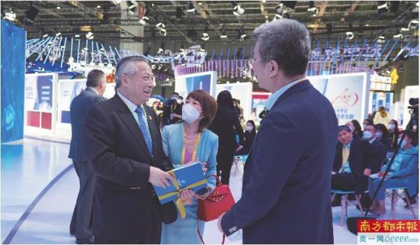 中国国际进口博览局副局长刘福学(左)和南方都市报总编辑刘江涛(右)在会场。