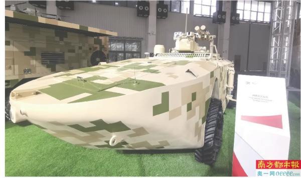 一款两栖无人战车将首次在兵器装备集团展区亮相。从外观上看,这款战车虽然仍沿用了“船体造型”,但采用了类似极地车的“三角履带”设计,进一步强化它在沙滩、泥地等恶劣路况下的通过性和机动性。顶部还有一具自动化武器站,集成了光电探头、红外探测等功能。它还装备了两具反坦克导弹发射器,具备对敌装甲目标进行打击的能力。