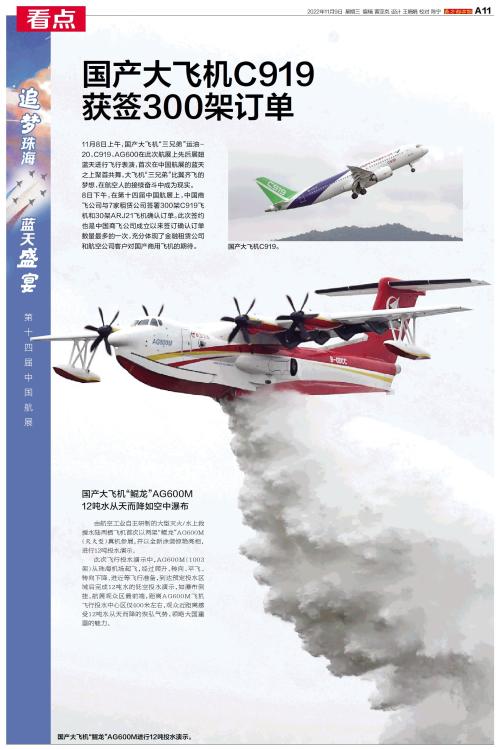 第十四届中国航展 11月8日上午,国产大飞机“三兄弟”运油-20、C919、AG600在此次航展上先后展翅蓝天进行飞行表演,首次在中国航展的蓝天之上聚首共舞,大飞机“三兄弟”比翼齐飞的梦想,在航