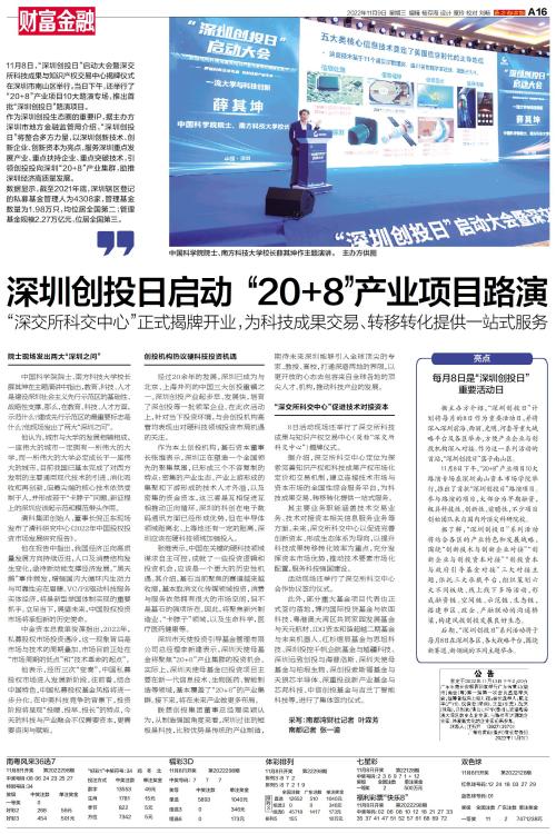 11月8日,“深圳创投日”启动大会暨深交所科技成果与知识产权交易中心揭牌仪式在深圳市南山区举行。当日下午,还举行了“20+8”产业项目10大路演专场,推出首批“深圳创投日”路演项目。 作为深圳创