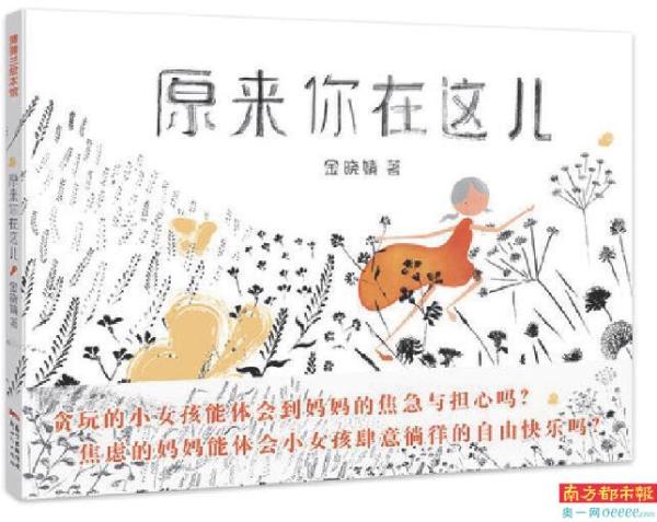 《原来你在这儿》是一本原创无字绘本。公园里,女儿因为追逐一只蝴蝶与妈妈走散了。妈妈在人群中焦急地寻找女儿。这是一个以作者童年经历为题材的故事。作者通过黑色和橙色的双线结构,表现了母女不同的世界和心情。全书不着一字,仅用图画向读者表达小女孩没有束缚后的自由,表达妈妈找不到孩子后的焦虑。从两个视角展现出孩子成长中对“分离”的理解。