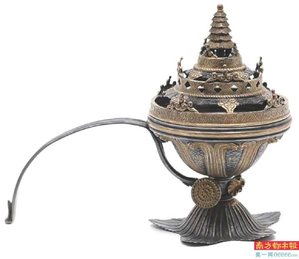“这件鎏金花足塔形炉造型尤为别致。”跟随梁玉文的介绍,我们看到,银炉足部如同展开的花朵,优雅精致;炉盖仿制宝塔造型,古朴端庄,鎏金之后添了几分华丽;炉身上接有长曲的手柄,便于持拿。“国内还未曾发现类似器形的香炉,所以更显弥足珍贵”。据了解,佛风鼎盛的唐朝,熏香器是当时人们家中重要的生活用具。不仅能够美化环境,还能够清新愉悦、养生祛病。在唐代,熏香十分普遍,上至皇宫贵族,下至百姓歌姬,都离不开香的陪伴。