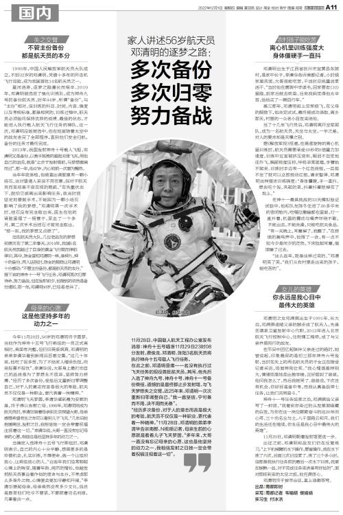 今年11月28日,56岁的邓清明终于圆梦。当他作为神舟十五号飞行乘组的一员正式亮相时,虽面有沟壑,但仍旧英姿飒爽。邓清明的弟弟李清华看到新闻后百感交集,“这几十年来,他吃了很多苦,为了不给家人增添负担,向来报喜不报忧”。李清华说,大哥身上最打动自己的品质是为了梦想永不放弃,坚持努力拼搏。“经历了多次备份,受挫后又重新归零调整自己,对于人的意志而言是很大的考验。航天员不仅仅是一种职业,更代表着一种精神。”