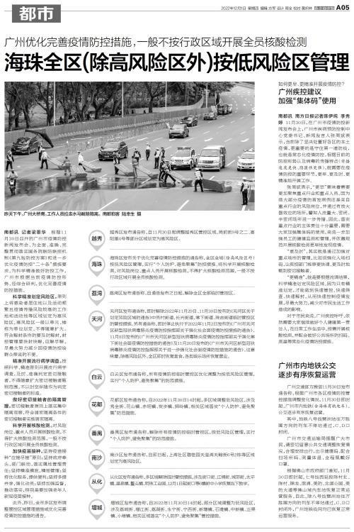 根据11月30日召开的广州市疫情防控新闻发布会,广州市根据当前疫情防控形势,经综合研判,优化完善疫情防控措施。