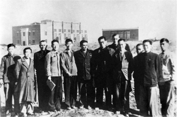 1956年,江泽民同志(左七)在长春第一汽车制造厂同援建一汽的苏联专家等合影。
