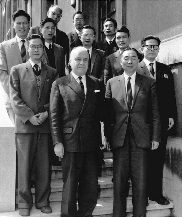1964年6月,江泽民同志(二排右一)在法国艾克斯莱班出席国际电工委员会会议期间同与会代表合影。