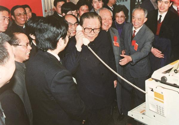 1984年5月,江泽民同志在北京展览馆举行的全国电子新产品展览会上,试用国际长途电话向远方的工作人员问候。