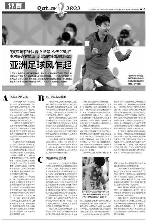 卡塔尔世界杯已进入更为残酷的淘汰赛阶段。北京时间昨天凌晨,荷兰队和阿根廷队占据两个八强席位,澳大利亚队和美国队止步16强。今晚明晨,日韩两队将陆续在1/8决赛中登场。无论亚洲球队能最终走到哪一步,他们追赶世界顶级水平的脚步声已足够响亮。