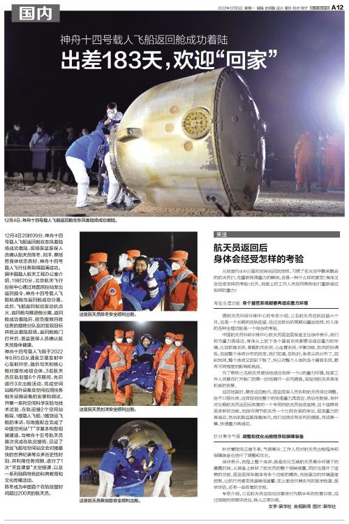 12月4日20时09分,神舟十四号载人飞船返回舱在东风着陆场成功着陆。
