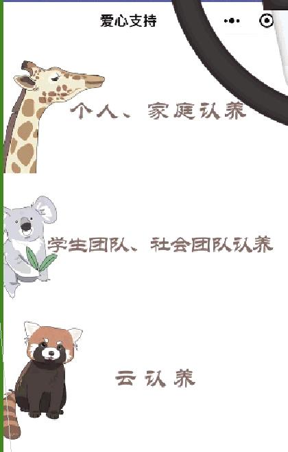 在红山森林动物园的小程序中,认养分为了个人、家庭认养,学生团队、社会团队认养,云认养几大类,其中都详细介绍了认养所能获得的福利:爱心电子卡一张、纸质认养证书一份、定期动物生活情况反馈、专属纪念品一份……