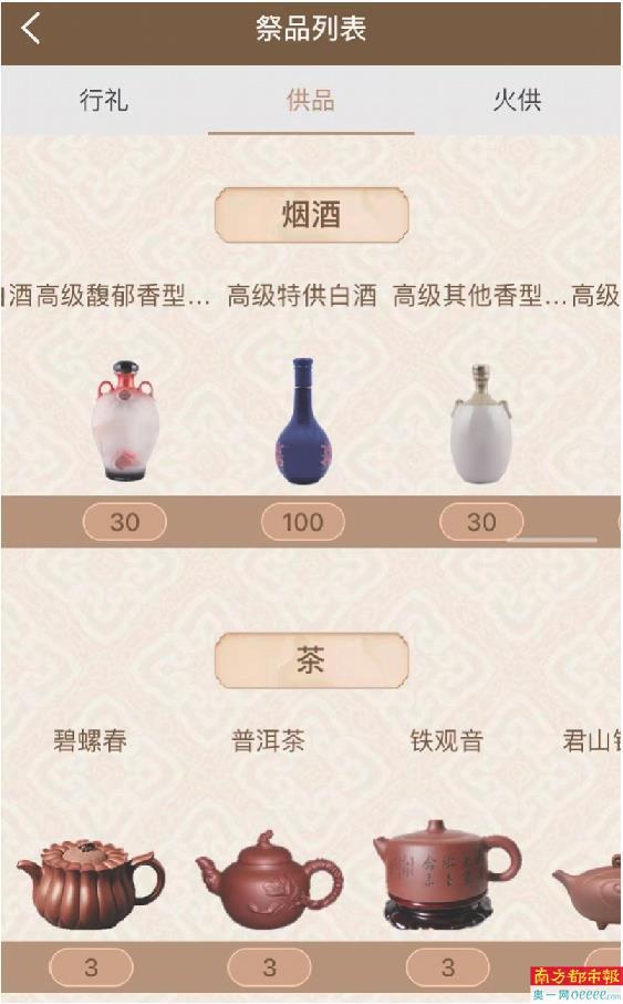 南都记者实测时发现,在“纪念宝”平台,网络“长明灯”的收费根据所选灯型每年300元至500元不等;“祭拜”可选择网络“行礼”“供品”“火供”等,其中网络烟酒供品收费较高,最贵的“高级特供白酒”6小时需付100纪念币,大约相当于100元。同样,在“祭奠堂”平台创建纪念馆后,选择进行“祭拜”和“点长明灯”也需收费,价格从1元到数百元不等。