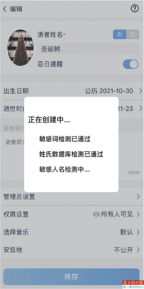 在“创忆”平台上,南都记者选用了一张圣诞树的图片作为逝者头像,逝者名字也为“圣诞树”,勾选出生到逝世时间,不到2年。提交信息后,平台出现一条弹窗,称敏感词、姓氏数据库、敏感人名检测均已通过,纪念馆创建成功。不过,一段时间后,该创建内容又被清理。平台提示,“请正确使用亲情纪念平台”。