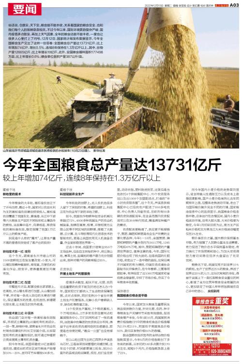 12月12日,国家统计局发布数据显示,今年全国粮食总产量达13731亿斤,比上年增加74亿斤,增长0.5%,连续8年保持在1.3万亿斤以上。