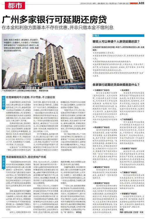 日前,包括工商银行、建设银行、农业银行、中国银行、交通银行、兴业银行、广州农商行等多家银行在广州地区的分行,都对个人房贷推出延期还贷服务。