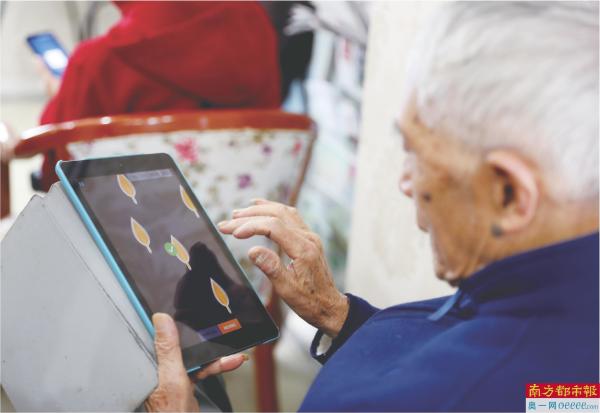 在上海市静安区江宁路街道爱老家园,一位老年人通过玩小游戏进行认知训练。 新华社发
