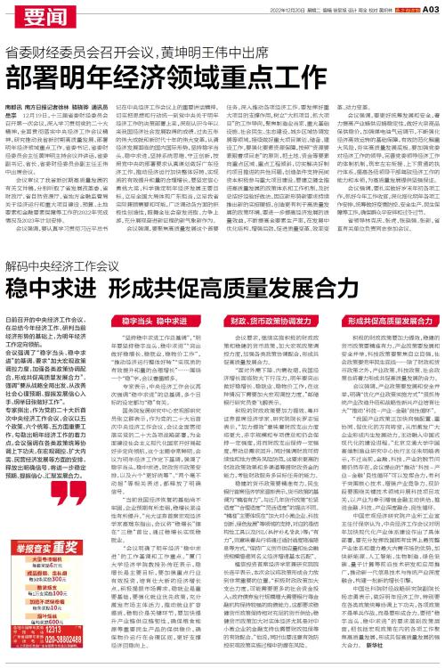 部署明年经济领域重点工作