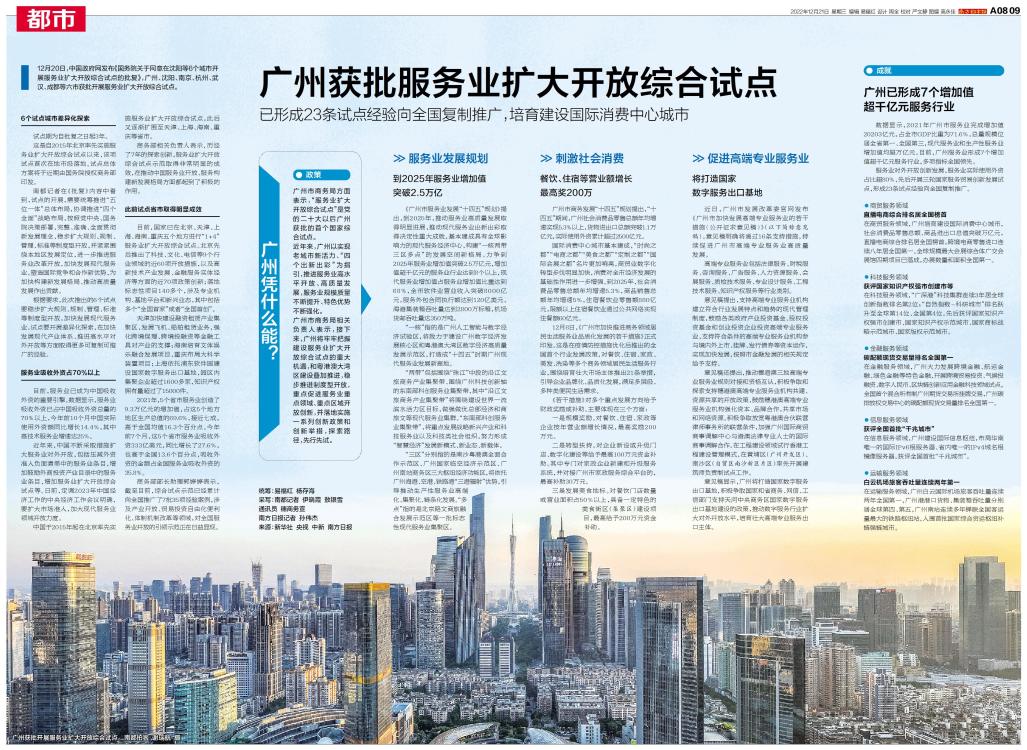 12月20日,中国政府网发布《国务院关于同意在沈阳等6个城市开展服务业扩大开放综合试点的批复》,广州、沈阳、南京、杭州、武汉、成都等六市获批开展服务业扩大开放综合试点。