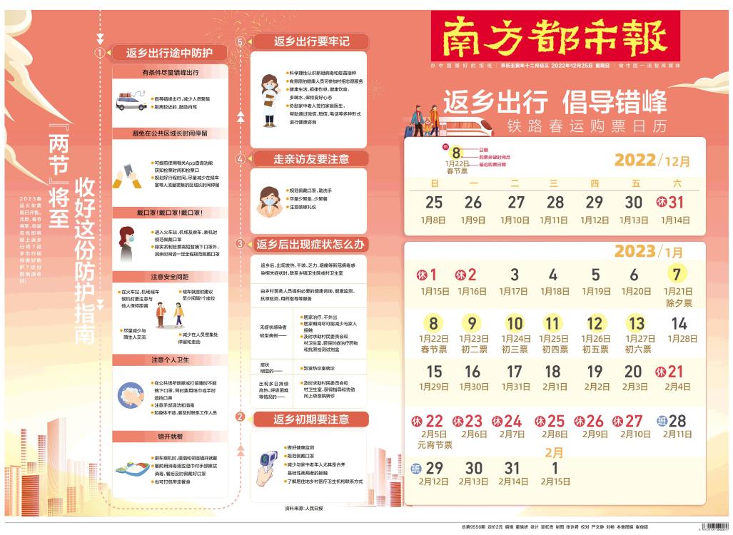 2023春运火车票现已开售。元旦、春节将至,你是否也即将踏上返乡行程?返乡出行如何做好防护?这份指南请收好。 资料来源:人民日报