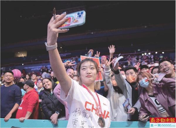 2022年10月1日,中国女篮李梦与球迷合影。
