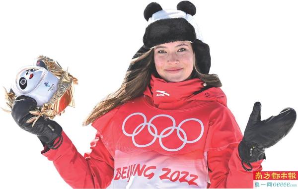 2022年2月18日,谷爱凌在冬奥会自由式滑雪女子U型场地技巧颁发纪念品仪式上。