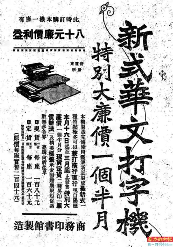 商务印书馆刊发的新式华文打字机宣传广告,广告中特别说明“舒震东发明”。