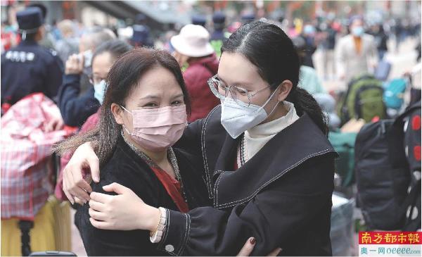 福田口岸大楼外,母女久别重逢,相拥安慰。