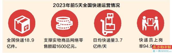 “经过前一阶段的不断努力,我们看到,全国快递员上岗率,到1月5日统计的情况来看,已经达到了94.9%,积压件的数量较前期大幅削减,快递服务已经有效恢复。”国家邮政局副局长陈凯在不久前举行的国新办发布会上透露,今年前5天,全国快递业务量日均数据达到3.7亿件,与去年同期相比增长16.7%;全国快递业务量达到18.9亿件,支撑实物商品网络零售额超过1600亿元。