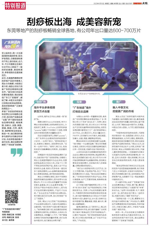 多家广东的刮痧板制造和经营企业向南都记者介绍,他们的产品靠品质“征服”多个国际知名美妆品牌和商超,畅销美国、加拿大、法国、英国、德国、韩国、巴西、墨西哥、俄罗斯等全球各地。新的一年,他们期待积极参与更多业内展会和研讨会,与全球各地的客户进行交流,通过品牌经营擦亮“广东制造”的招牌。