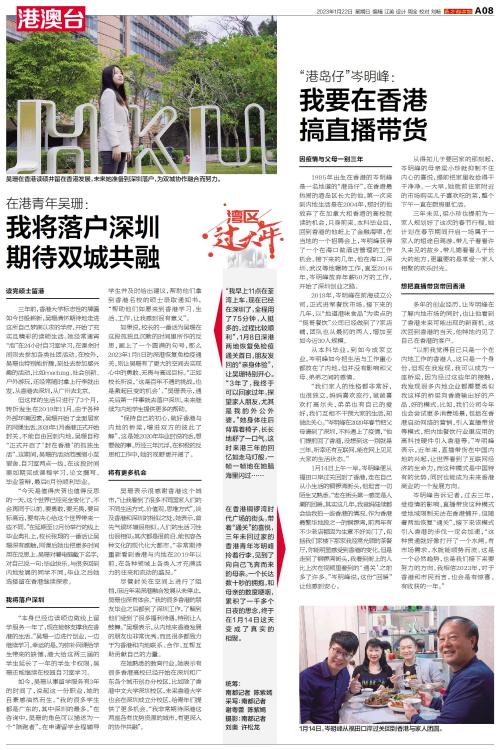 岑明峰告诉记者,过去三年,受疫情的影响,直播带货这种模式受地域限制无法在香港铺开。但随着两地恢复“通关”,接下来该模式引入香港的步伐一定会加速,“这种贯通就好像打开了一个水闸,有市场需求,水就能顺势而流。这是一个必然趋势,也是我们接下来要努力的方向。我相信2023年,对于香港和市民而言,也会是有惊喜、有收获的一年。”
