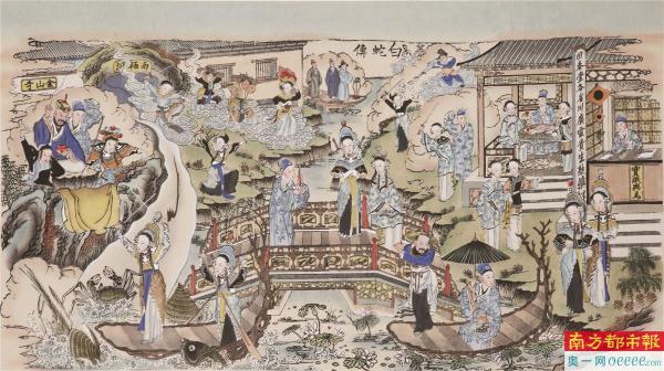 策展人之一张荣芳指出,在这类年画中,最著名的要数“戏出年画”。“画中要有戏,百看才不腻”。清代是戏曲文化的繁荣时期,年画中也出现了大量以戏曲剧目为题材的作品。因为一个独立剧目名为“出”,故这类年画被称为“戏出年画”。寻常百姓既可以从“戏出年画”中品味戏曲的精妙,也可以通过戏曲故事学习知识。戏出年画主要分为两大类:一是用传统故事年画画面搭配戏装扮相的人物;二是完全还原戏曲舞台的全貌。她指着杨柳青年画《白蛇传》向南都记者介绍,“这幅年画,它看起来是一幅戏出年画,但它表现了11个场景,基本上把《白蛇传》这个故事讲得差不多了。年画的左上方是光怪陆离的景象,如水漫金山;下方又是世俗生活化的场景,许仕林中状元等,然后通过断桥会的水加上两岸就把整个故事的画面串联了起来,这11个故事,包括白娘子端午节喝酒、借伞,各种各样的小故事在一幅年画中讲尽了白蛇传的故事。”
