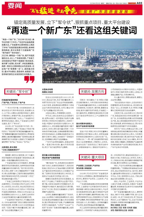 近年来,随着高质量发展在广东政府、企业、社会等各个层面逐渐凝聚共识,类似东华能源这样随着招引重大项目快速落地,随之带动起本地产业链、产业集群发展的例子正越来越多。“大项目”“大企业”“大投资”在当前广东推进高质量发展上起到的重要作用。