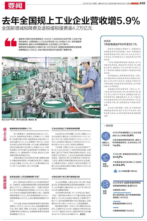 国家统计局昨日发布数据显示,2022年,工业经济运行总体平稳,工业生产销售持续增长,全国规模以上工业企业营业收入比上年增长5.9%。