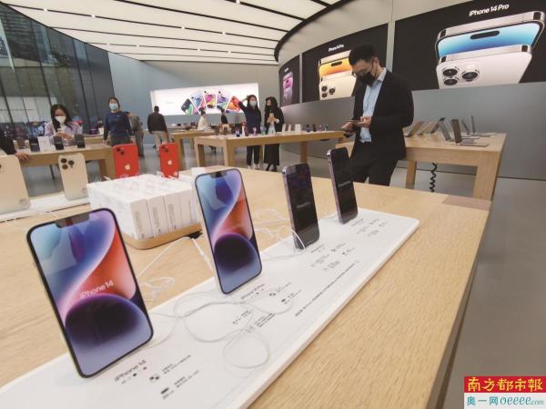 南京新街口苹果旗舰店,市民在选购iPhone14系列手机。 IC供图