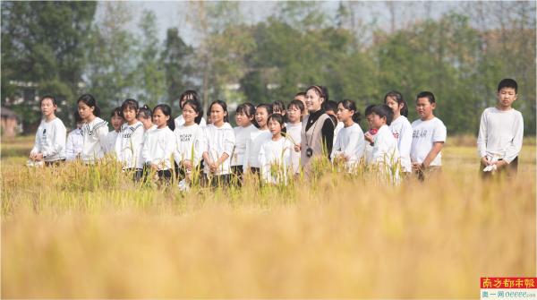 桃源县郑家驿镇澄溪桥村稻田,老师带领学生观看农机收获水稻。 新华社发