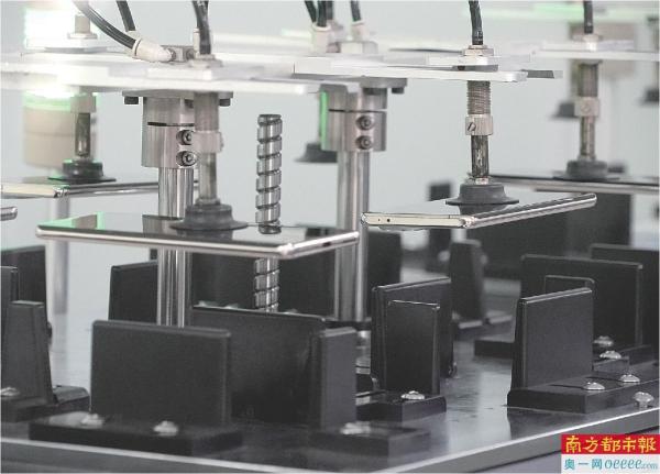 实验检测中心里,机器装置自动重复做着实验,“整个生产线自动化程度非常高,”据工作人员介绍,在手机贴片这一环节,需要把电阻、电容等小型元器件以及CPU、硬盘等大型元器件贴装到手机主板上,“基本上只需要3-5名员工就可以管控并完成这一环节。”