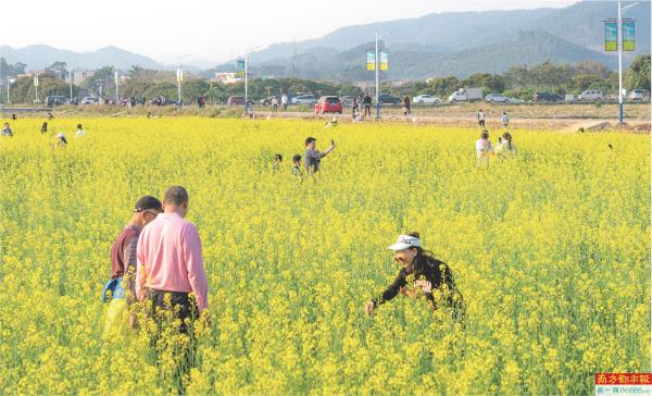 2月26日,广州增城区丝苗米省级现代农业产业园3000亩油菜花争相竞放,吸引大量游客观赏。南都拍客 冯健文 摄