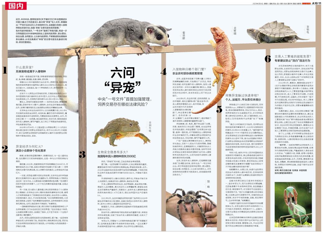 有关专家学者表示,“一号文件”强调了异宠问题,将进一步引导我国在对外来物种的防控上坚持风险预防、源头管控、综合治理、协同配合、公众参与的原则,不断推进防控措施体系化建设。从司法角度对“异宠”的交易与放生乱象进行规制,依旧任重道远。