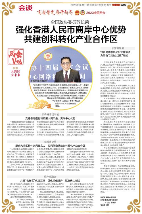 今年全国两会,苏长荣带来两份提案,一是建议国家能够支持香港强化、拓展人民币国际离岸中心的优势;二是关于香港、佛山共建创科转化产业合作区的建议。