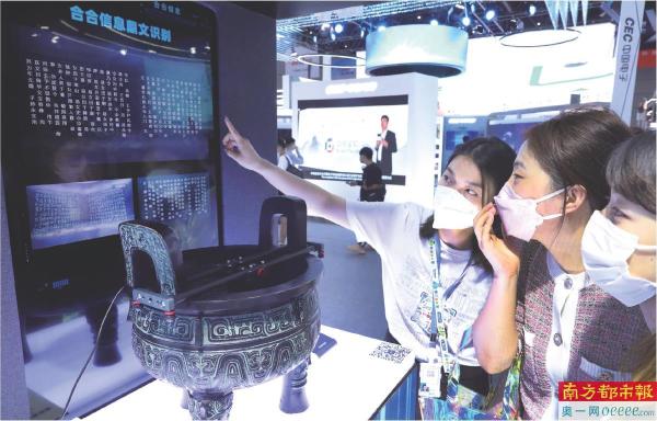 2022世界人工智能大会上,工作人员向参观者介绍一款智能文字识别AI系统对青铜鼎铭文的识别展示。 新华社发(资料图)