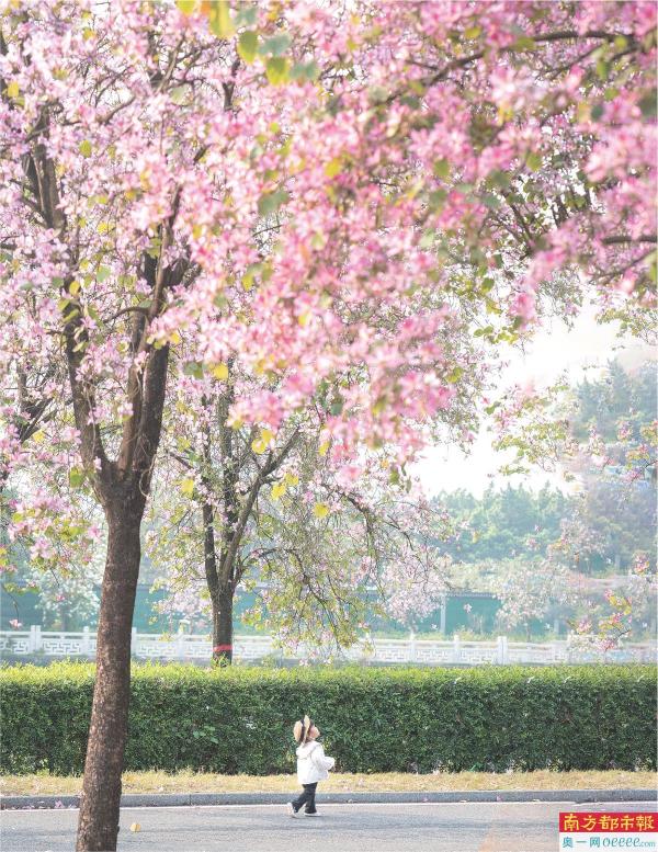 今日是春分节气。这是3月3日,广州海珠国家湿地公园的宫粉紫荆花满园怒放,小女孩正在抬头观花。 南都拍客 陈晓红 摄