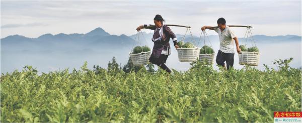 贵州省榕江县忠诚镇苗本村的农民在梯田上搬运西瓜。广东省佛山市南海区“东西部协作”对口帮扶榕江县,带动山区农产品出山。 新华社发