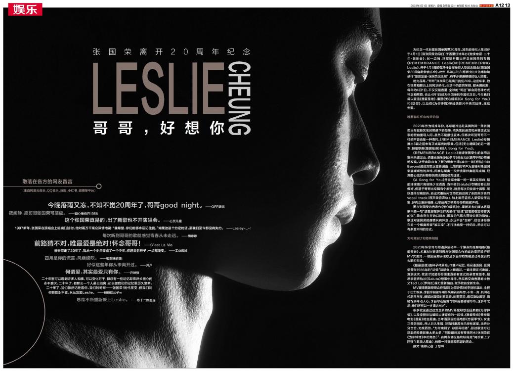 二十年里可以遇到许多人和事,可以变化万千,但总有一些记忆却依然长留心间永不磨灭。二十年了,有那么一个人虽已远离,却长留我们的记忆里历久常新。二十年了,我们依然记挂着你,我们的哥哥——张国荣!时代在变,但我们对你的爱永不变,永远宠爱Leslie。——翩翩佳公子w
