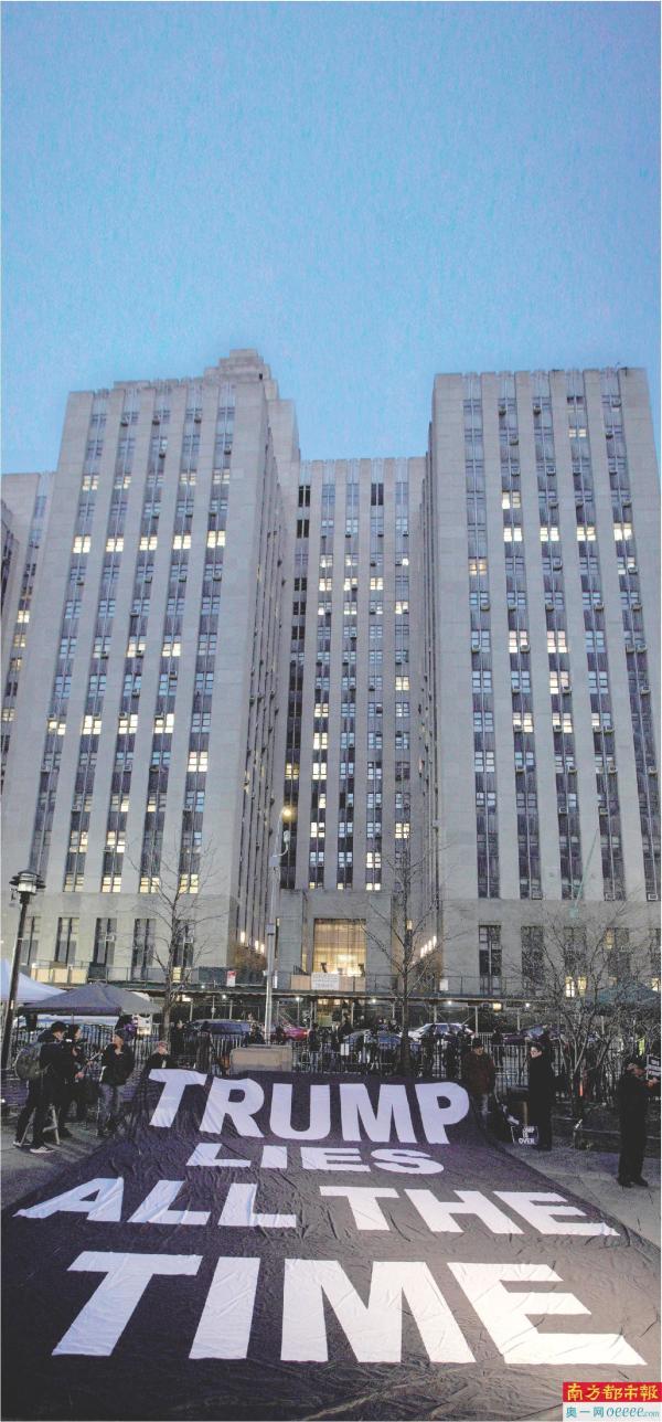 3月30日,人们在美国纽约曼哈顿刑事法院外打出“特朗普一直撒谎”的标语。 新华社发
