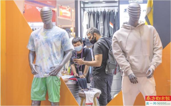 2021年10月15日,第130届广交会正式开门迎接全球采购商,在服装展区,来自国外的采购商在一展位里问价。 南都记者 谭庆驹 摄(资料图)