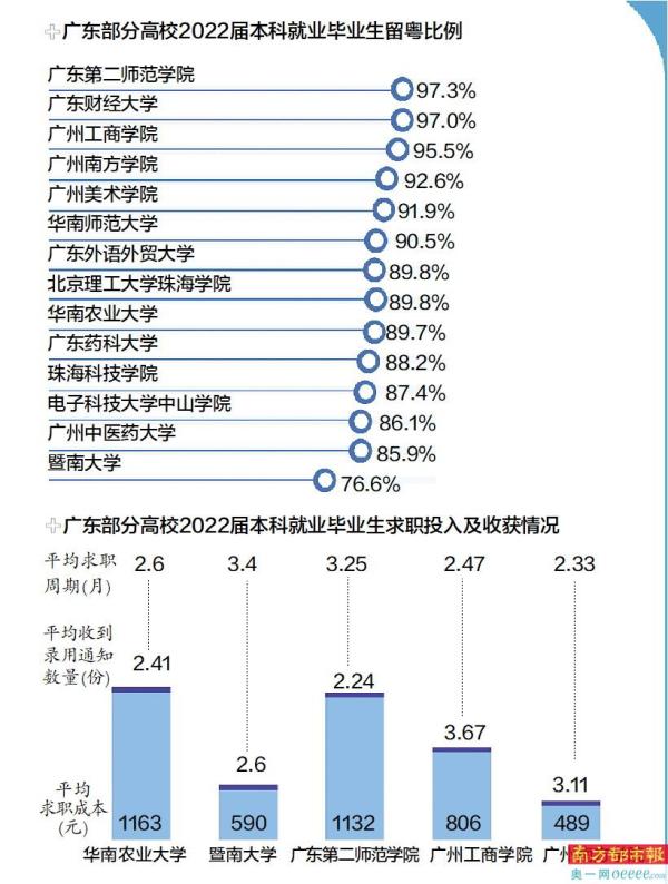 数据显示,暨南大学等5所高校的2022届毕业生平均求职周期都在2-4个月之间。5所高校中,广州南方学院的同学平均求职成本最低,仅为489.93元;广州工商学院的同学平均收到3.67份录用通知。